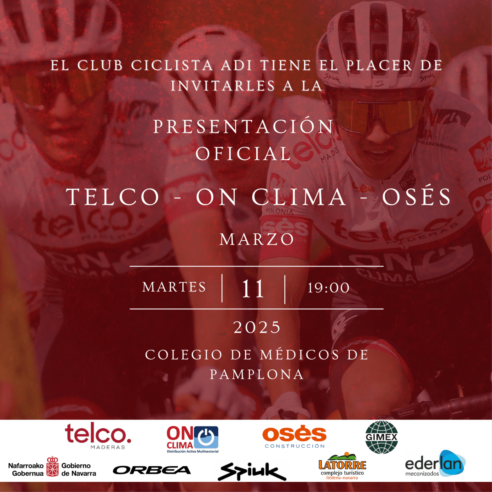 El Colegio de Médicos de Pamplona ha albergado este martes la puesta de largo del equipo navarro élite y sub-23 Telco – ON Clima – Osés, una estructura con más de 45 años de historia pelotón amateur. En esta puesta de largo, con la presencia de autoridades, familiares y aficionados al ciclismo, el equipo haSigue leyendo «Presentado el proyecto 2025 del Telco – ON Clima – Osés»